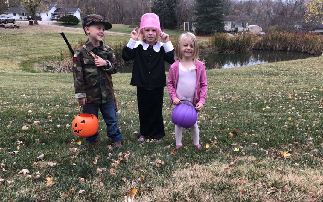 Last week we joined the droves of people heading out for our annual candy collection on Halloween. The kids counted down for days until Trick or Treat finally arrived. This year we had a pilgrim, a hunter, and a ballerina.We actually had good weather this year, which really brought out the crowds. We started out on the city block where we used to live, and at first there weren’t that many people walking the sidewalks with us. But as we headed for our second block, the crowds really ticked up. Our youngest can be a bit clingy in a crowd, so I was pleasantly surprised that she was running up ahead of us with her brother and sister. After retrieving her candy from each porch, she would turn around and make eye contact with me, making sure she knew exactly where I was. After we entered one particularly crowded area, I could see her scanning the crowd, searching faces for mine. There was just enough time looking that I thought she might start to cry. But I had my eye on her the whole time. I waved and called her name. When she spotted me, relief visibly washed over her face, and she said, “There you are!”
