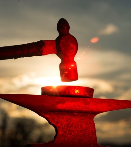 I pull open the door and step into the shop. There is no natural light; any glass has long ago been made opaque by decades of torch soot and diesel exhaust. I pause like a spelunker waiting for my eyes to adjust to the dim atmosphere. Still temporarily blind, I call on other senses in an attempt locate this twenty first century blacksmith. Off in the far corner, I hear the band saw gnawing at a piece of steel and smell the acrid odor of oil impregnated metal as it surrenders to the harangue of the relentless blade. Soon my vision improves and I see smoke pluming from the metal saw and wafting slowly toward the curved corrugated roofline destined to add yet one more coat of grime to an already established coal-black color palette. David comes into focus—one hand on his hip, the other resting patiently on the arm of the band saw.