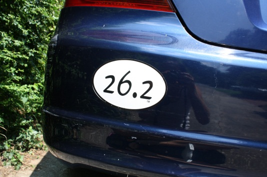 26 point 2I thought it was an ad for a lousy radio station—you know, that white oval on the rear window of SUVs that simply says “26.2”? That doesn’t even come in on my dial. So then I reasoned it might be a secret number for a clandestine society.  Once, seeing a young person exiting his Land Rover with the mysterious sticker, I sidled up and whispered, “26.2…” hoping for a knowing nod and a special handshake.  By the way, did you know that a restraining order specifies how many feet you must stay away from the complainant?